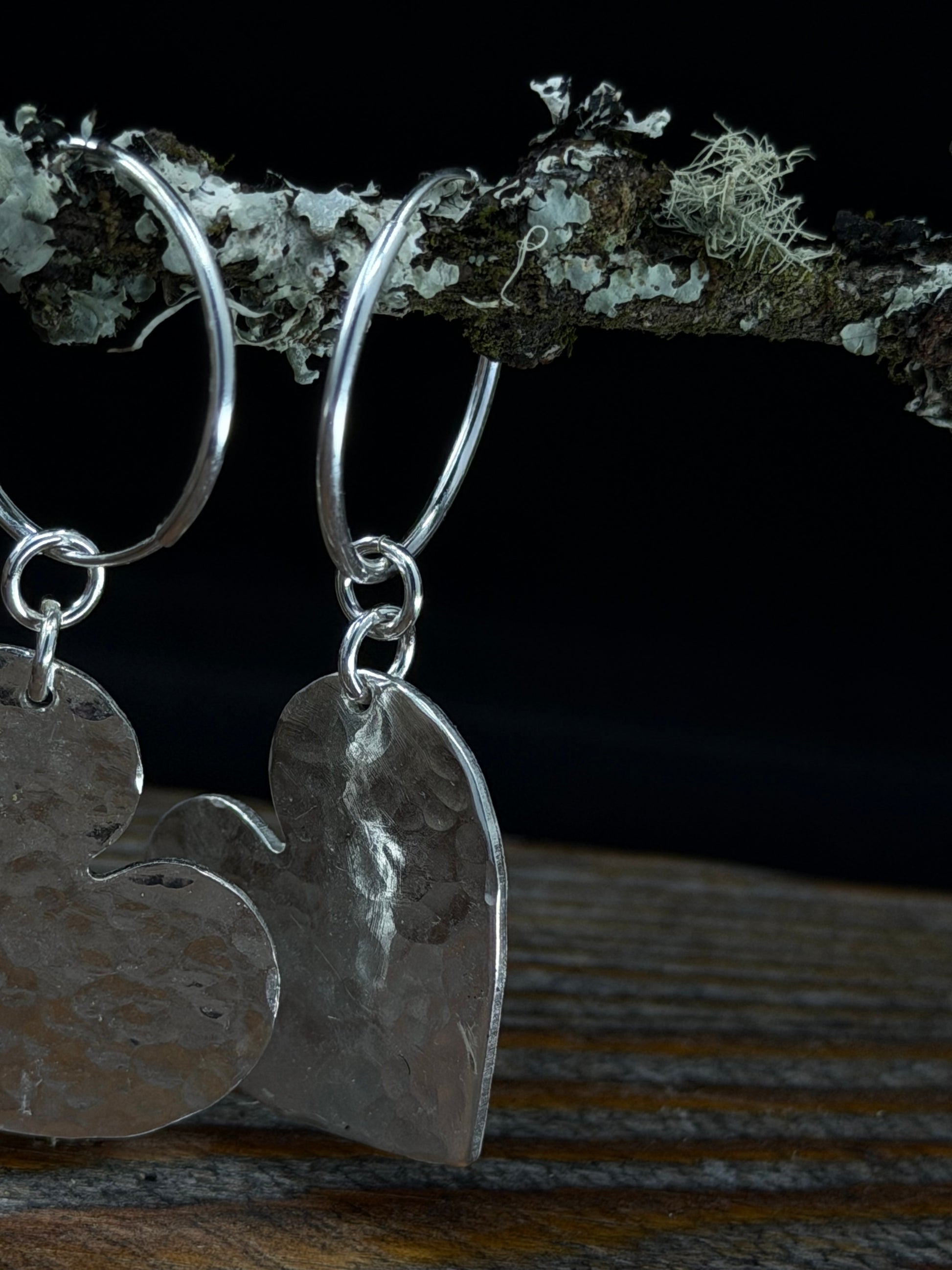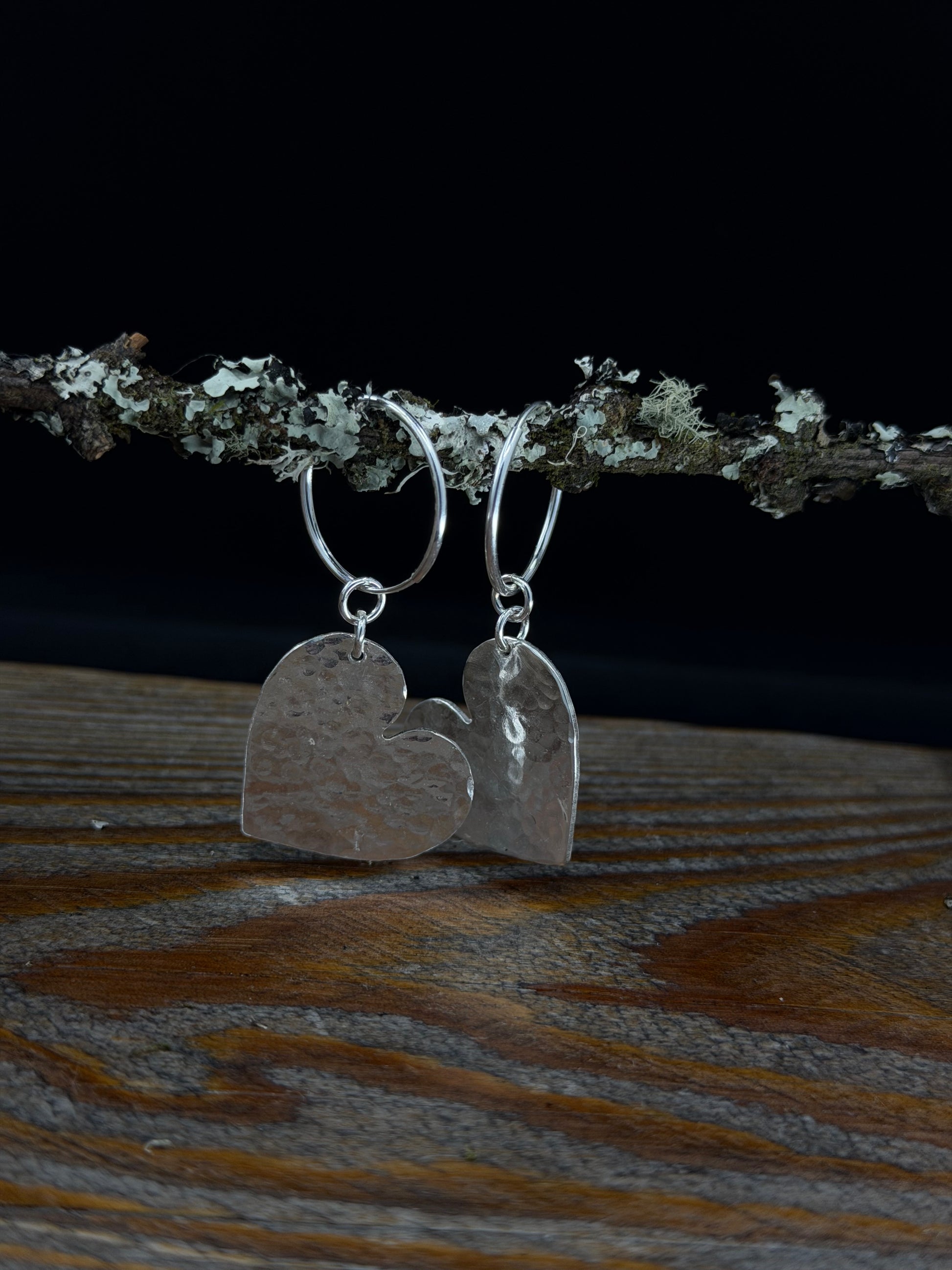 These Freya Earrings are handmade and crafted with a solid sterling silver hammered heart on a drop and hoop style earring. This piece is both bold and elegant.