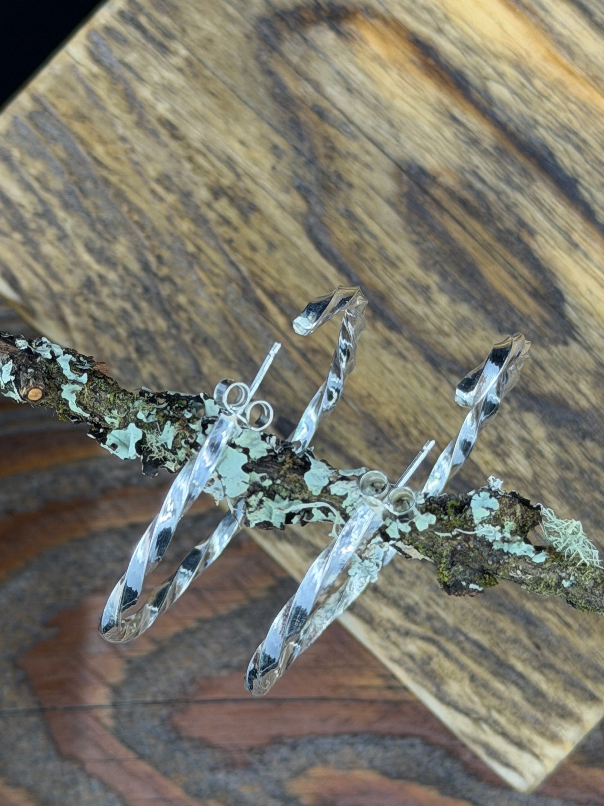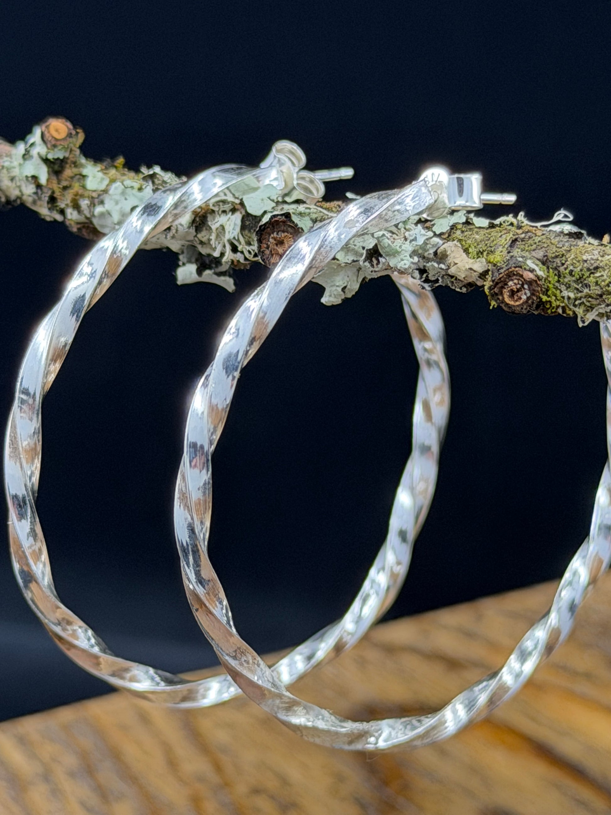 The She Walks Her Own Path Earrings are handmade and crafted with 2mm solid sterling silver, pressed and twisted to form large hoop earrings. Each earring measuring 40mm in drop and width, on a post style earring wire. Featuring a bold and dramatic square twisted wire,  wear them on their own, or as part of an earring stack set.